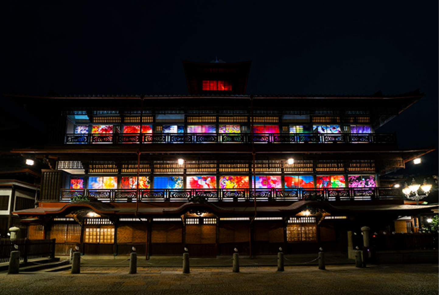 道後温泉本館が蜷川さんとクリエイティブチームEiMの作品で彩られます。四季の花々や金魚などの写真を36点設置。夜間にはライトアップが行われ、昼と夜で表情が変わる大規模なインス タレーションです。